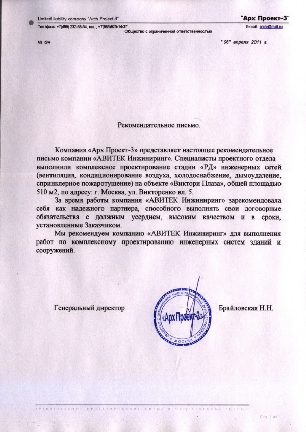 Благодарственное письмо от ООО «Арх Проект-3» -
