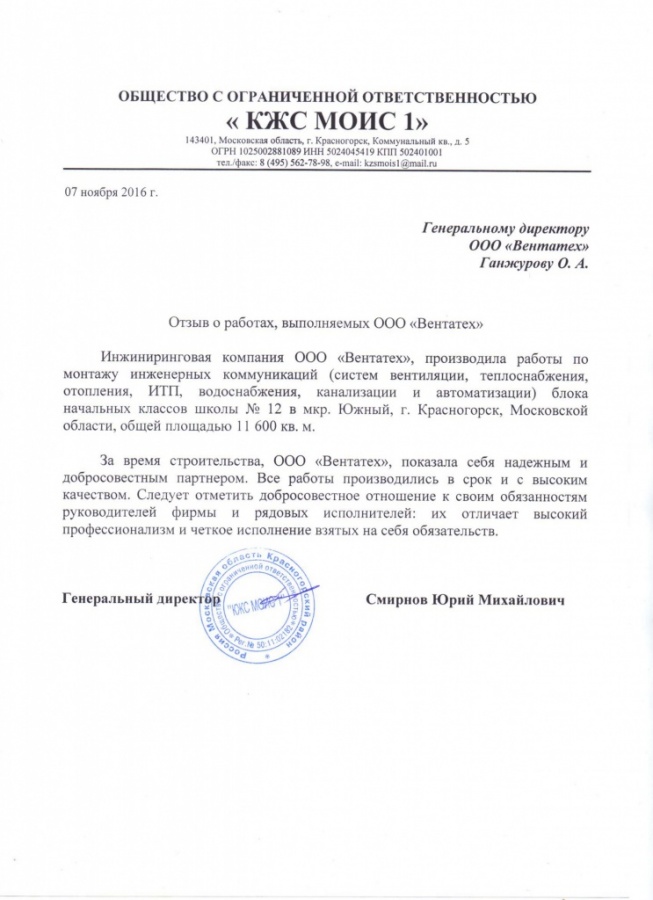 Отзыв от ООО «КЖС МОИС 1» -