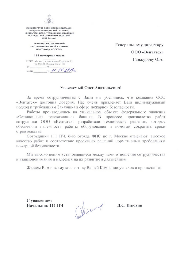 Благодарственное письмо от 111-ой пожарной части -