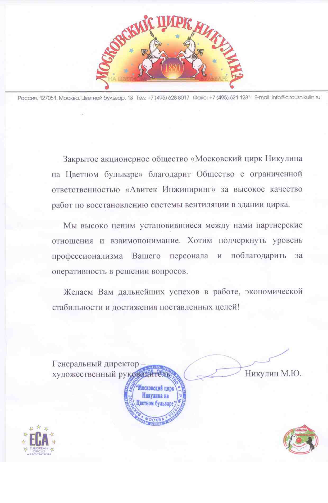 Благодарственное письмо от "Московского цирка Никулина" -