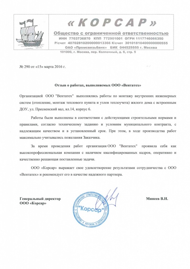Отзыв от ООО "Корсар" -